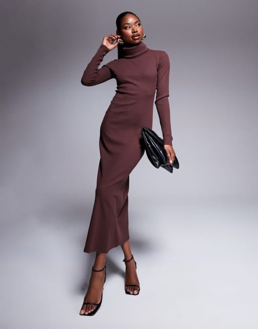 ASOS DESIGN - Geribbelde halflange jurk met col in bordeauxrood