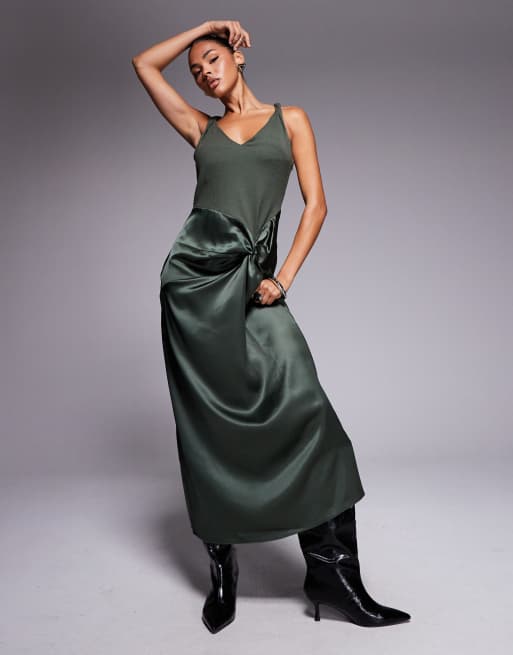 ASOS DESIGN - Geribbelde midi jurk met gedraaide bandjes en geknoopte rok van satijn in kaki