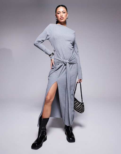 ASOS DESIGN - Geribbelde midi jurk met lange mouwen, rechte hals en gedraaide voorkant in grijs