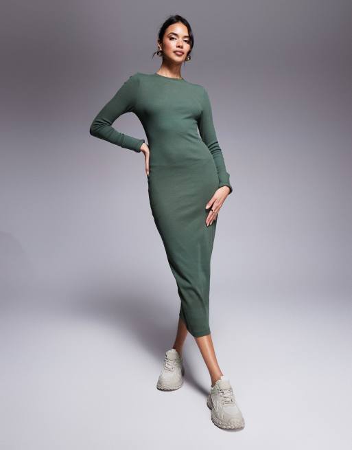 ASOS DESIGN - Geribbelde midi jurk met ronde hals en omgeslagen manchetten in groen