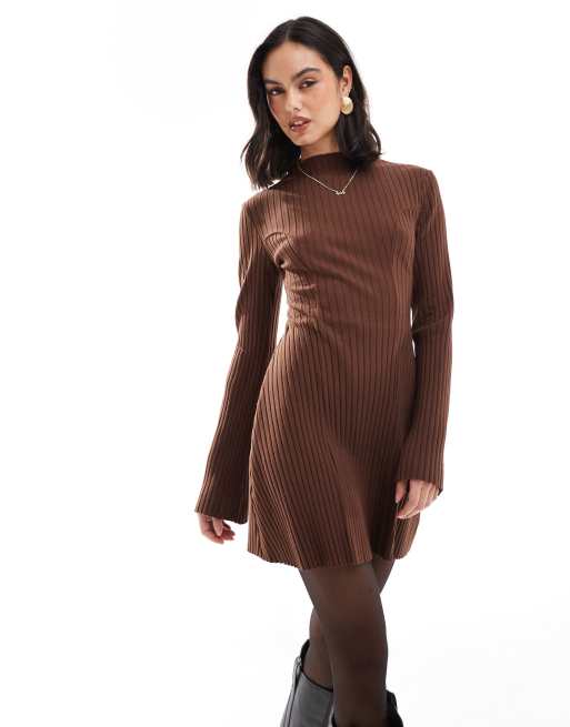 ASOS DESIGN - Geribbelde mini sweaterjurk met wijde lange mouwen in bruin