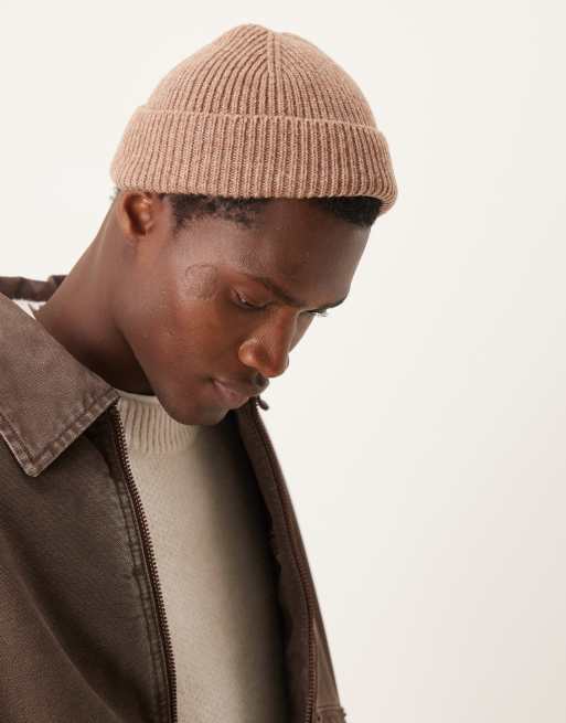 ASOS DESIGN - Geribbelde mini vissersbeanie van lamswol in bruin