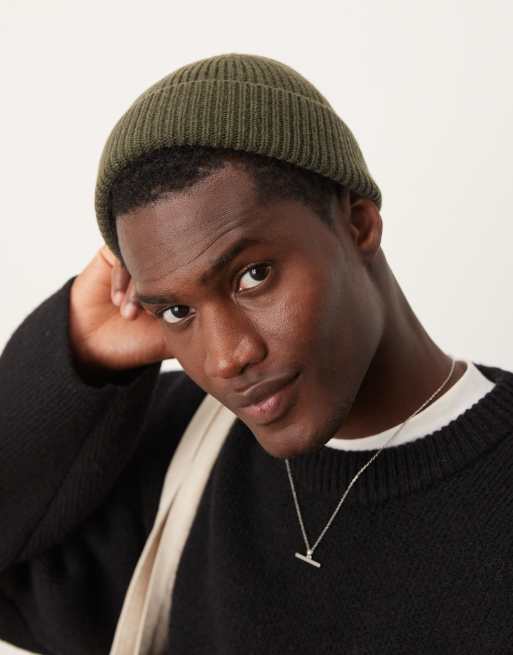 ASOS DESIGN - Geribbelde mini vissersbeanie van lamswol in kaki