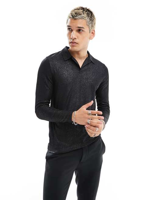ASOS DESIGN - Geribbelde muscle fit polo met lange mouwen en reverskraag in zwart met glitter