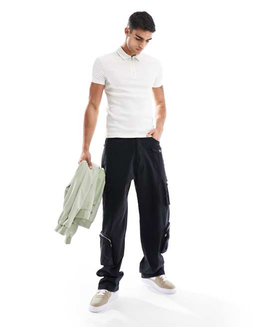 ASOS DESIGN - Geribbelde muscle fit polo met rits aan de hals in ecru