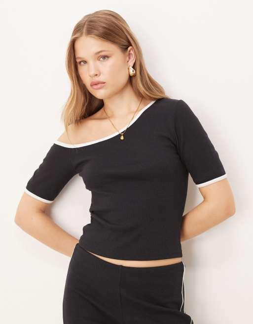 ASOS DESIGN - Geribbelde top met blote schouder en contrasterende biezen in zwart
