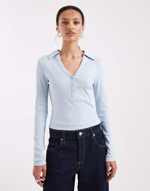 ASOS DESIGN - Geribbelde top met Henley-hals, gekrompen design, kraag en lange mouwen in lichtblauw