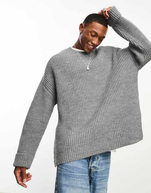 ASOS DESIGN - Geribbelde trui van zware wolmix met zijsplitten in lichtgrijs