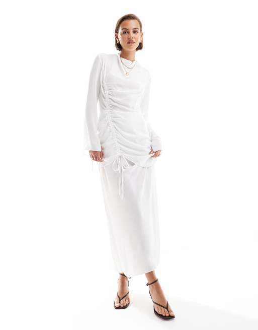 ASOS DESIGN - Gerimpelde gestrikte maxi jurk met lange mouwen in wit