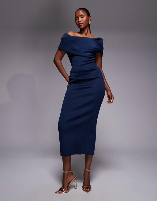 ASOS DESIGN - Gerimpelde midi bardotjurk van scuba-achtige stof in marineblauw
