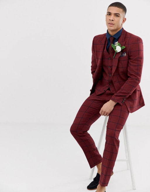 ASOS DESIGN - Geruit skinny kostuum van wolmix in bordeauxrood