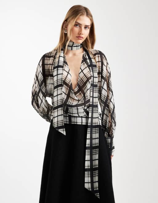 ASOS DESIGN - Geruite blouse van chiffon met gedrapeerde sjaal-halslijn