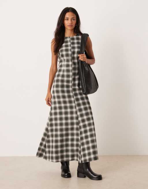 ASOS DESIGN - Geruite maxi jurk van satijn met racerhals in marineblauw