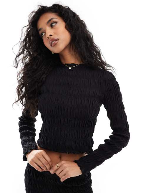 ASOS DESIGN - Gesmokte top met lange mouwen in zwart