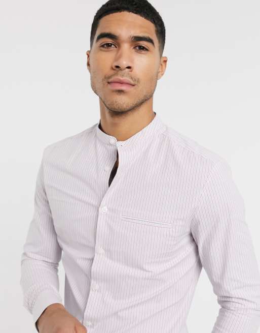 ASOS DESIGN - Gestreept skinny-fit overhemd zonder kraag in rood en marineblauw