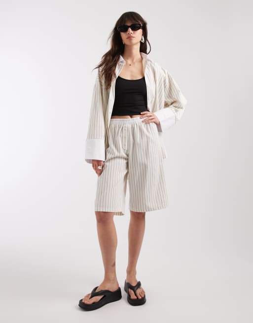 ASOS DESIGN - Gestreepte bermudashort met elastische tailleband in ecru, deel van co-ord set