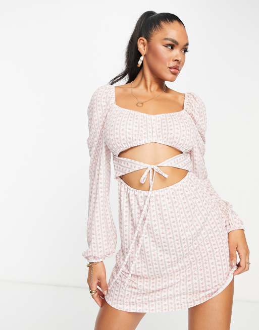 ASOS DESIGN - Gestreepte jurk met bloemenprint, lange mouwen en uitsnijdingen in roze