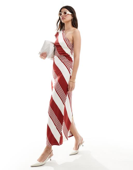 ASOS DESIGN - Gestreepte midi jurk met blote schouder en gerimpelde zijkant in wit en rood