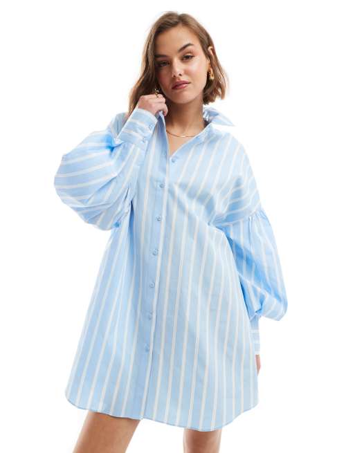 ASOS DESIGN - Gestreepte mini-overhemdjurk in boyfriend-stijl met blousonmouwen in lichtblauw en wit