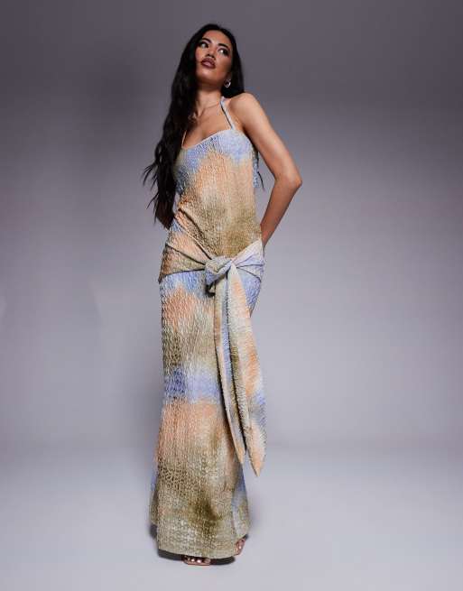 ASOS DESIGN - Gestructureerde asymmetrische halter midi-jurk met sjerpdetail in groene kleurverloopprint