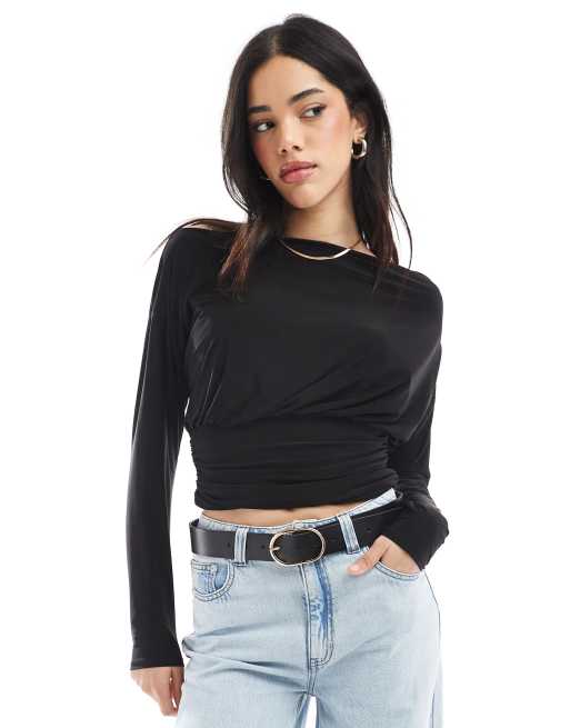 ASOS DESIGN - Getailleerde top met blote schouders en lange mouwen in zwart