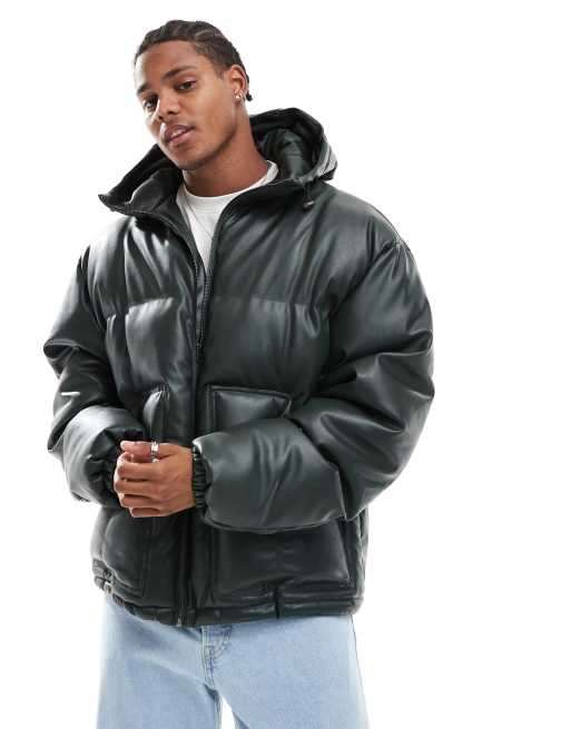 ASOS DESIGN - Gewatteerd puffer jack van imitatieleer met capuchon in groen