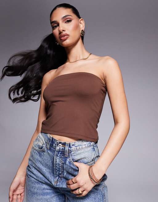 ASOS DESIGN - Gladde bandeau-top van premium polyamide in chocoladebruin