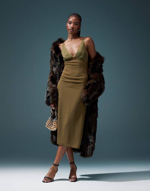 ASOS DESIGN - Halflange cami-jurk met kant in kaki