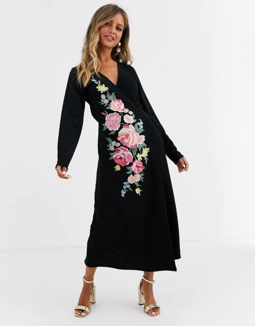 ASOS DESIGN - Halflange geborduurde jurk met overslag en lange mouwen