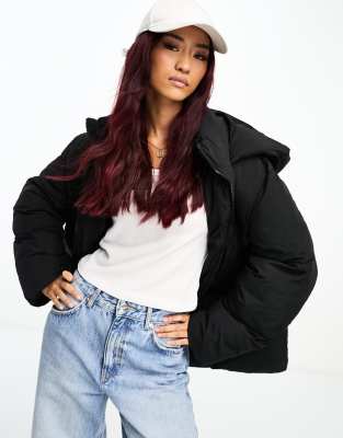ASOS DESIGN - Halflange gewatteerde puffer jas met capuchon in zwart