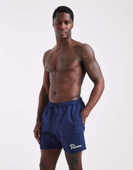 ASOS DESIGN - Halflange zwemshort met borduursel in marineblauw