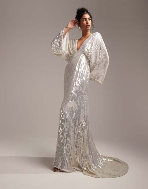 ASOS DESIGN - Harriet - Diepuitgesneden trouwjurk met kimonomouwen en lovertjes in ivoorwit