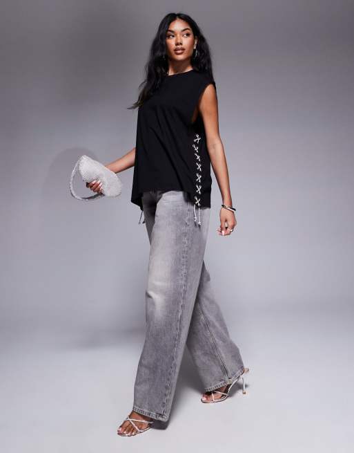 ASOS DESIGN - Hemdje met veters met siersteentjes aan de zijkant in zwart