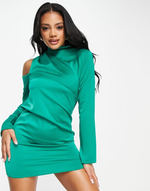 ASOS DESIGN - Hooggesloten mini-jurk van gedrapeerd satijn met blote schouder