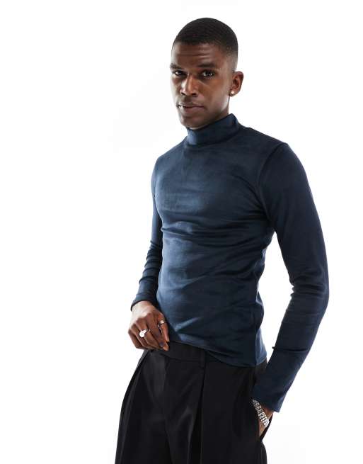 ASOS DESIGN - Hoogsluitend muscle fit T-shirt met lange mouwen in marineblauw velours