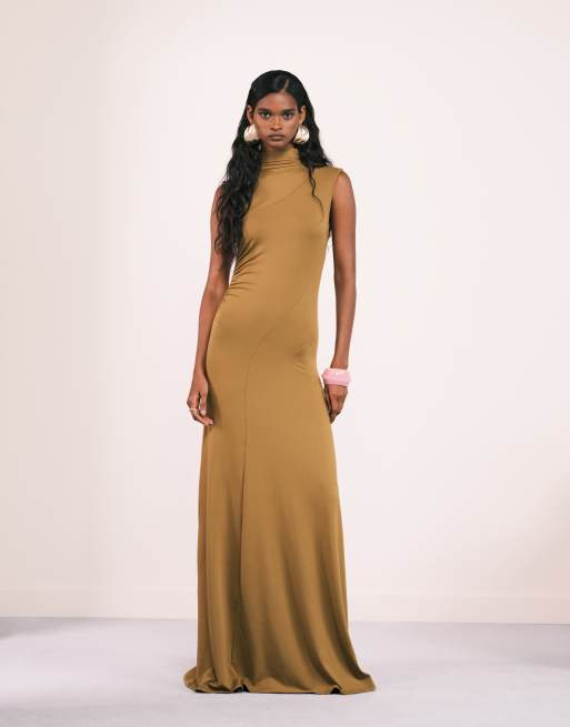 ASOS DESIGN - Hoogsluitende gedrapeerde maxi-jurk met siernaden in mosterdgeel