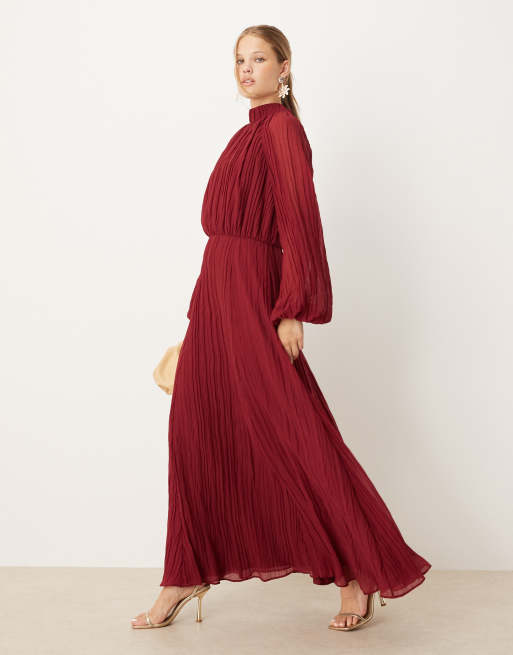 ASOS DESIGN - Hoogsluitende maxi-jurk van kreukelstof met blousonmouwen in diep bessenrood