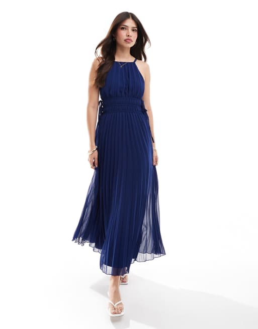 ASOS DESIGN - Hoogsluitende midi jurk met gerimpelde taille in marineblauw