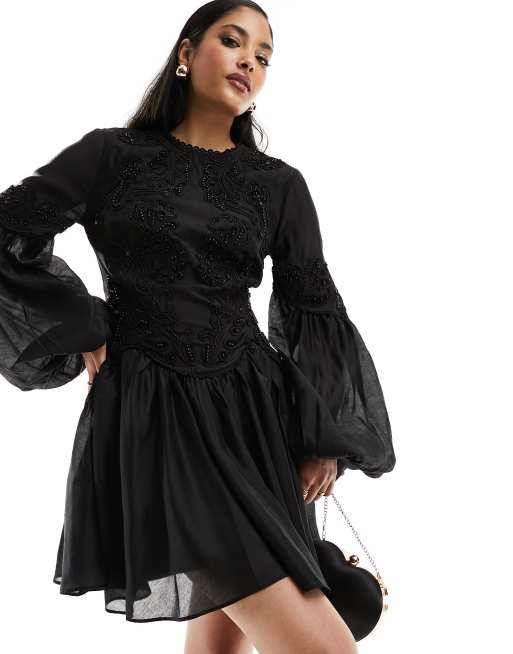 ASOS DESIGN - Hoogsluitende mini jurk van katoen versierd met borduurwerk en volant langs zoom in zwart