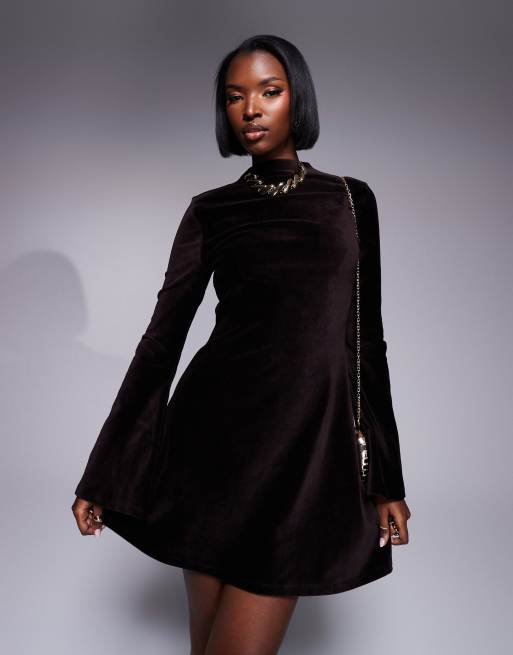 ASOS DESIGN - Hoogsluitende mini-jurk van ribfluweel met uitlopende mouwen in bruin