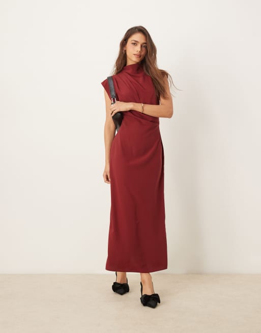 ASOS DESIGN - Hoogsluitende mouwloze midi jurk met gedrapeerde halslijn in bordeauxrood