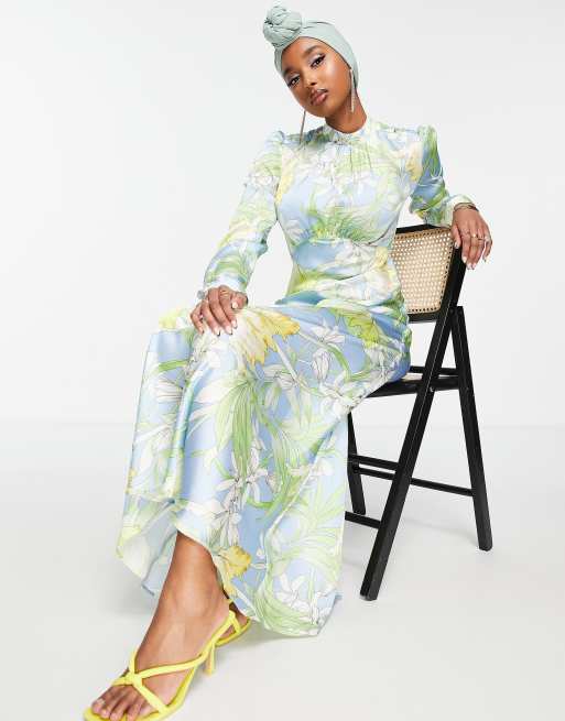 ASOS DESIGN - Hoogsluitende satijnen maxi-jurk met bloemenprint