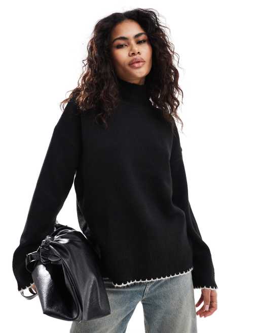 ASOS DESIGN - Hoogsluitende trui met ronde hals en festonsteek in zwart