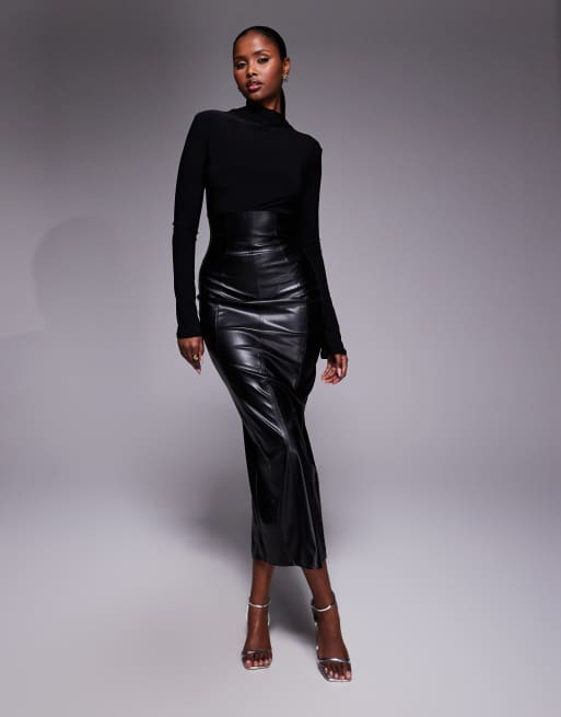 ASOS DESIGN - Hybride midi-kokerjurk met lange mouwen en leerlook in zwart