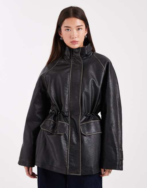 ASOS DESIGN - Jack met opstaande boord en leerlook met wassing in zwart