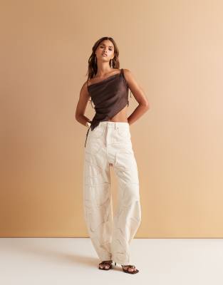 ASOS DESIGN - Jeans met wijde ronde pijpen en hoge taille in ecru met wervelende print in dezelfde tint
