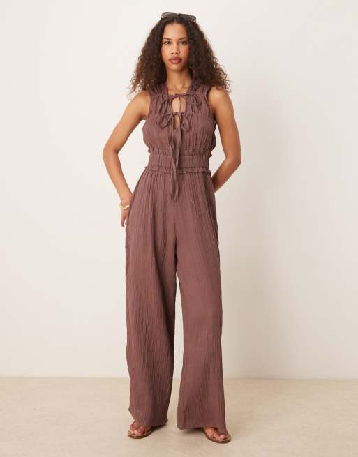 ASOS DESIGN - Jumpsuit met aangerimpelde buste van dubbele stof in donkerbruin