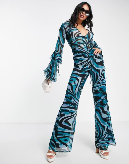 ASOS DESIGN - Jumpsuit met diepe V-hals, ruches en wijde pijpen in dierenprint
