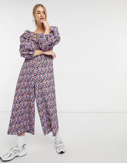 ASOS DESIGN - Jumpsuit met gestrikte voorkant en dubbele pofmouwen in paars met bloemenprint