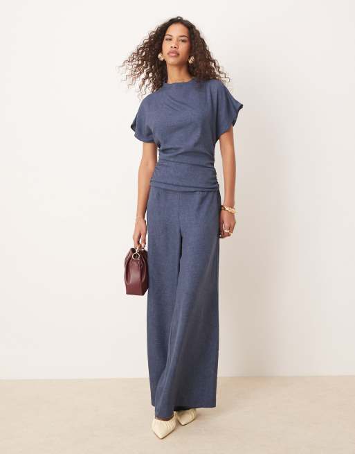 ASOS DESIGN - Jumpsuit met linnenlook, open achterkant en gerimpeld detail in marineblauw